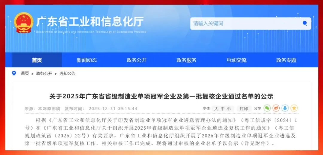 2025年12月31日,广东省工业和信息化厅发布了《2025年广东省省级制造业单项冠军企业及第一批复核企业通过名单的公示》,广东贝洛新材料科技有限公司成功入选省级制造业单项冠军企业。